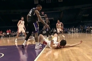 丹尼斯推倒扣篮后的杨瀚森吃T