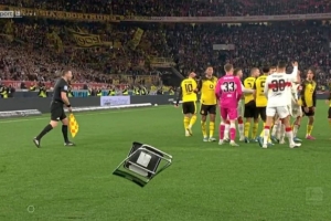 多名斯图加特极端球迷翻越围栏,冲入内场区域,甚至来到了电视转播席旁,距离球员仅有几米远。从背景中可以看到,一把折叠椅朝着多特蒙德球员的方向飞来。这把椅子显然属于坐在球门后方区域的摄影师,此后比赛随即结束。