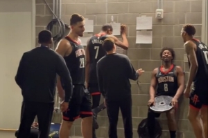 赛后,腾讯ESPN记者孟超发博晒出视频,并写道:“险胜勇士之后,火箭赛后在更衣室外全体加练。”