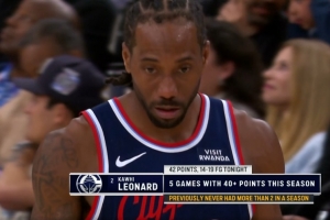 如日中天!伦纳德19中14已砍42分 本赛季个人第5次得分40+